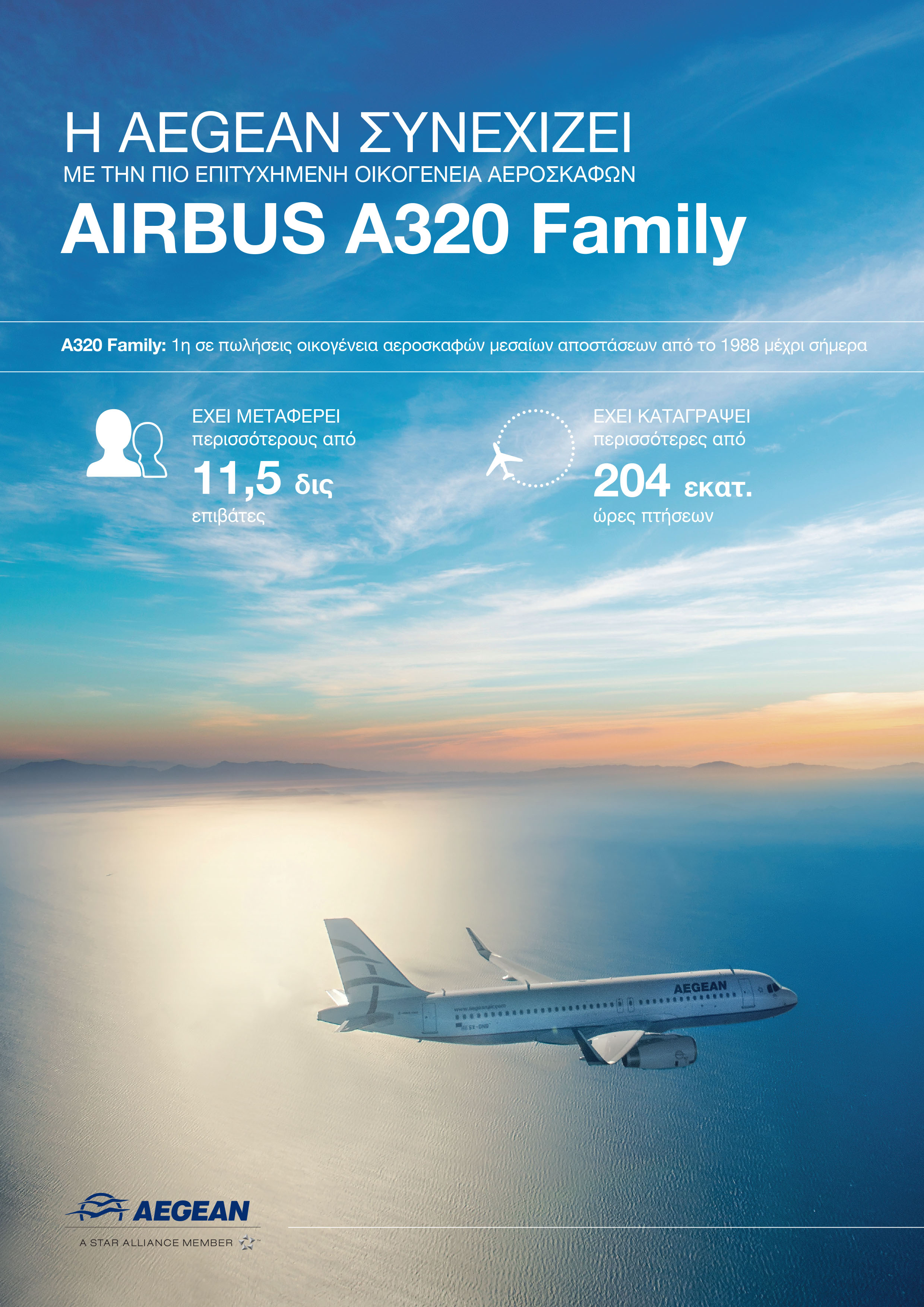 Υπενθυμίζεται ότι το 2017 ο στόλος της AEGEAN αριθμούσε 46 jet αεροσκάφη της οικογένειας A320, καθώς και 12 turboprop αεροσκάφη. Η εν λόγω συμφωνία αποτελεί μέρος ενός συνολικού προγράμματος επέκτασης και ανανέωσης του στόλου της εταιρείας, που αναμένεται να υλοποιηθεί μεταξύ των ετών 2020-2025.