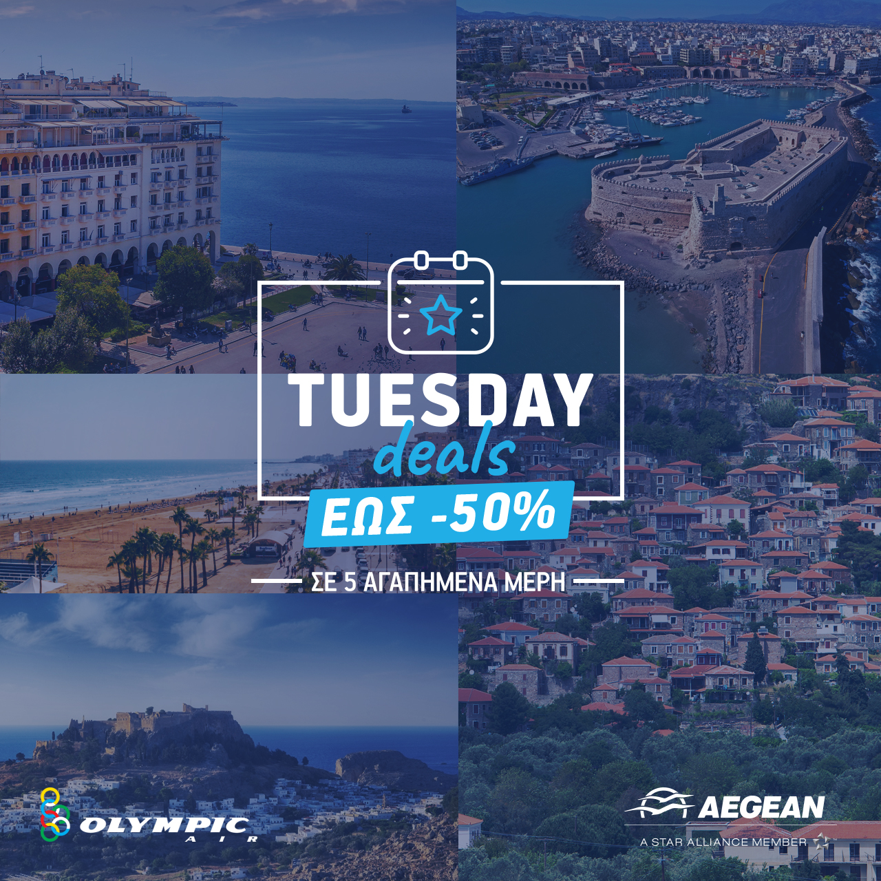 Από αυτή την εβδομάδα και κάθε Τρίτη, η AEGEAN θα μοιράζεται τα Tuesday Deals, δίνοντας την ευκαιρία στο επιβατικό κοινό για μια ολόκληρη εβδομάδα να αξιοποιήσει τις ελκυστικές προσφορές της. Κάθε Δευτέρα οι συγκεκριμένες προσφορές θα ολοκληρώνονται δίνοντας τη σειρά τους στις ευκαιρίες της επόμενης εβδομάδας.